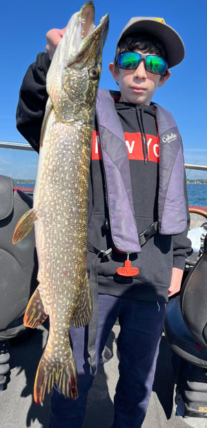 After a few drifts and enough walleye for a big dinner, we motored back up the spot for another pass. I suggested Eli leaving his line in the water close to the boat, sort of how one would troll a "prop wash" line for muskies. Sure enough, just as I stopped the boat, Eli got hit by another long pike.