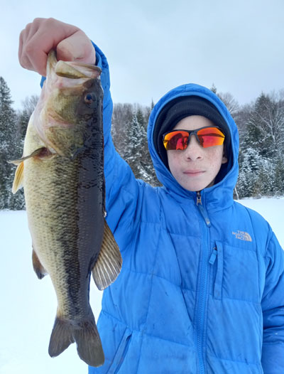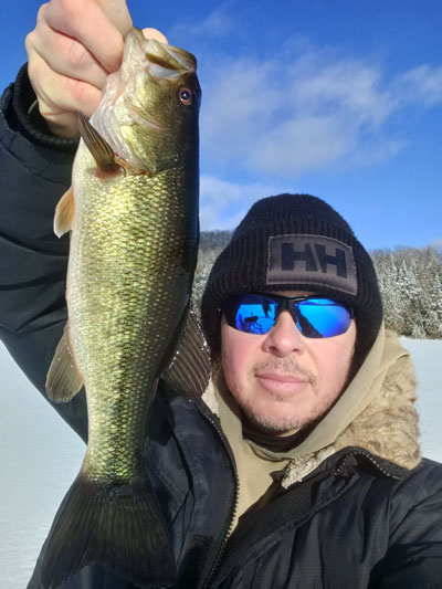 For our next outing together the following week, I picked up a couple Zippo electronic rechargeable hand warmers on clearance at Sail. Definitely get a lot hotter than the disposable powder ones. We headed up to a lake where I've had some very productive fishing for a mix of largemouth and smallmouth bass, as well as jumbo perch. With the weather hovering around -5 and very little wind, it was about as good of a day as I could hope for.