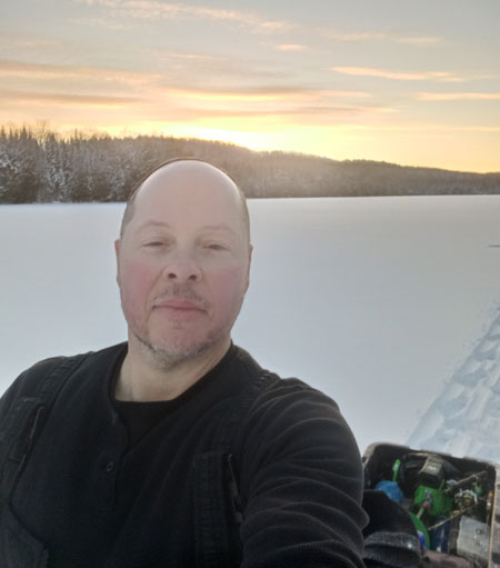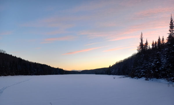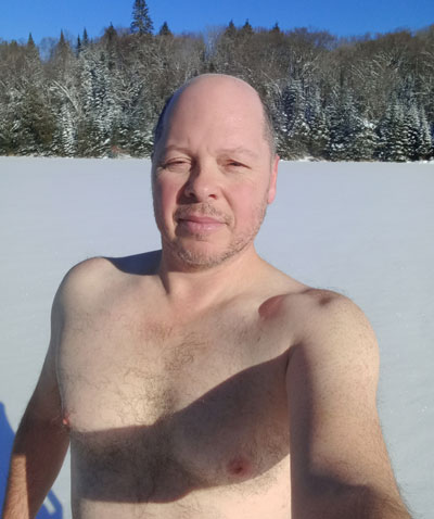 Nearly half hour trekk on foot to my spot, towing the gear sled. Wearing that many layers, it takes very little time to heat up. It's crucial to avoid getting your underlayers sweaty, to avoid freezing later. As such, I remove most layers for the walk. Sometime, there is only one way to cool off.